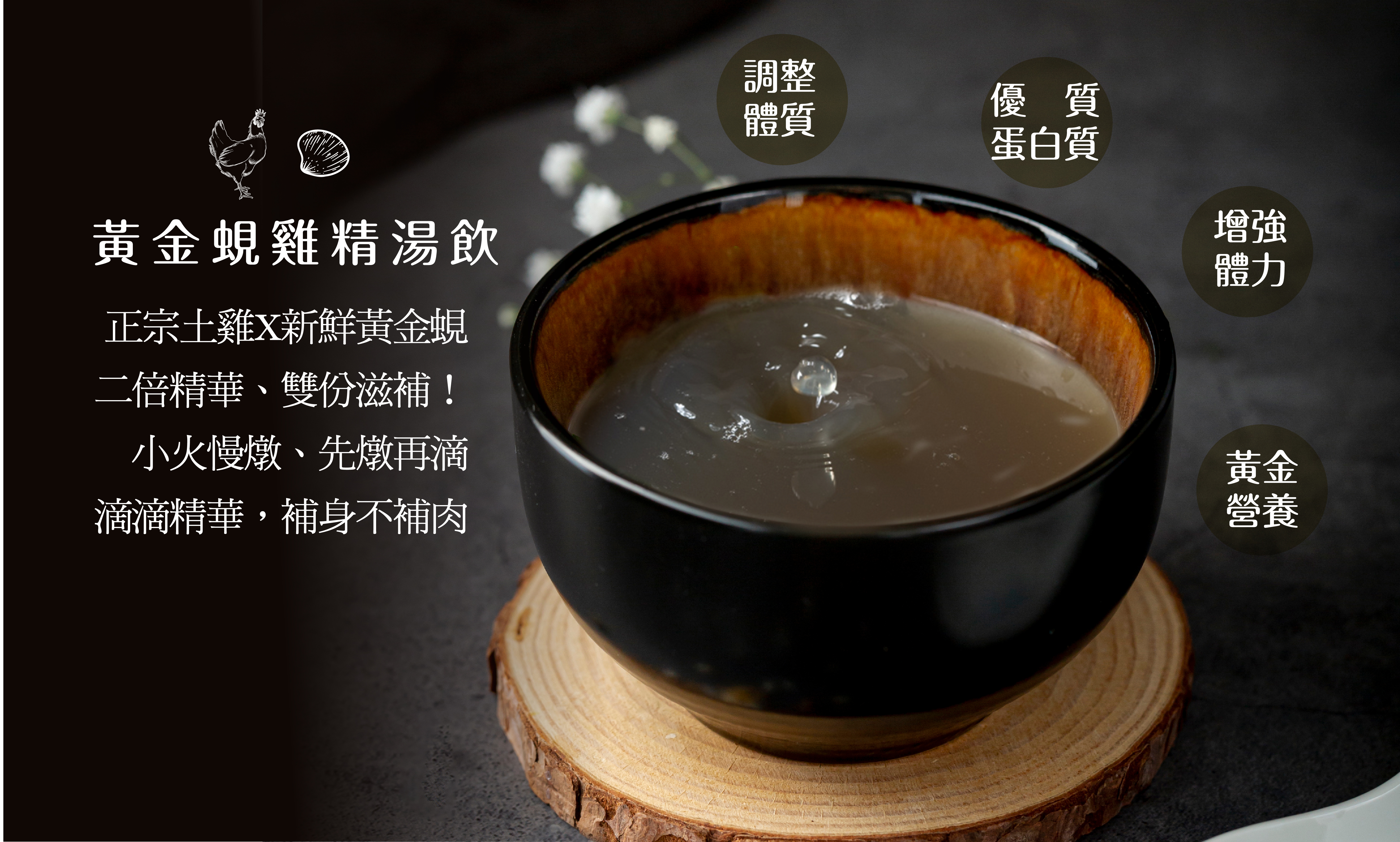 採用100%正宗台灣土雞x新鮮黃金蜆精